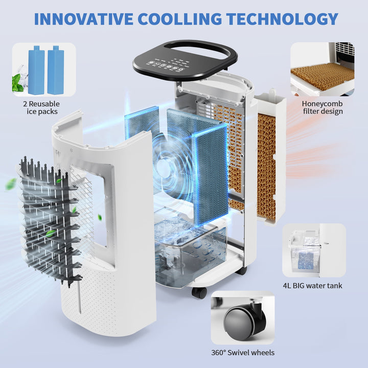 High Portability and Convenient Cleaning: This evaporative air cooler with 4 universal wheels can be moved effortlessly and is suitable for various places such as bedroom, living room, office and more. The built-in air filter not only provides fresh and cool air but also is removable and washable for convenient cleaning.