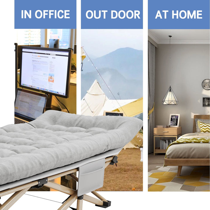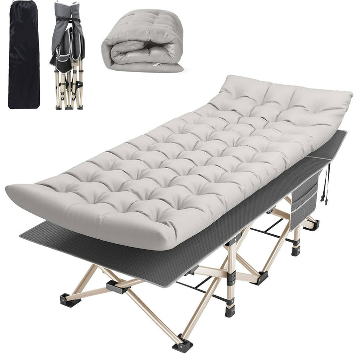 UPGRADE WITH MATTRESS AND PILLOW: More comfort with less pay. The mattress is fitted with soft material and is about 3.4 inches thick. The compact carry bag makes storage convenient and enjoys it anywhere as if you are at home. SMALL COLLAPSIBLE DESIGN: Nice C's Camping cot is made with a foldable iron shock-cord pole structure that allows it to be folded up and fitted into its sturdy, nylon-strapped carrying case easily. The size of the cot is similar to that of a twin-size bed. The fold-up size of the cot is 11" ¡Á 6" ¡Á 40" (L¡ÁW¡ÁH), and weighs only 13.9 lb: it can be easily carried on your back and stored in a car. COMFORTABLE DESIGN: Our camping cot is ergonomically designed to give you comfort while using it. The angled head along with the removable pillows allows you to rest your head comfortably instead of lying flat. The sides of the cot have pockets for you to store your water, phone, etc. There is no need to bring a mattress pad, sheets, or pillows on your camping trip. Take this cot to all your outdoor activities: camping, BBQ, beaches, picnics, etc.