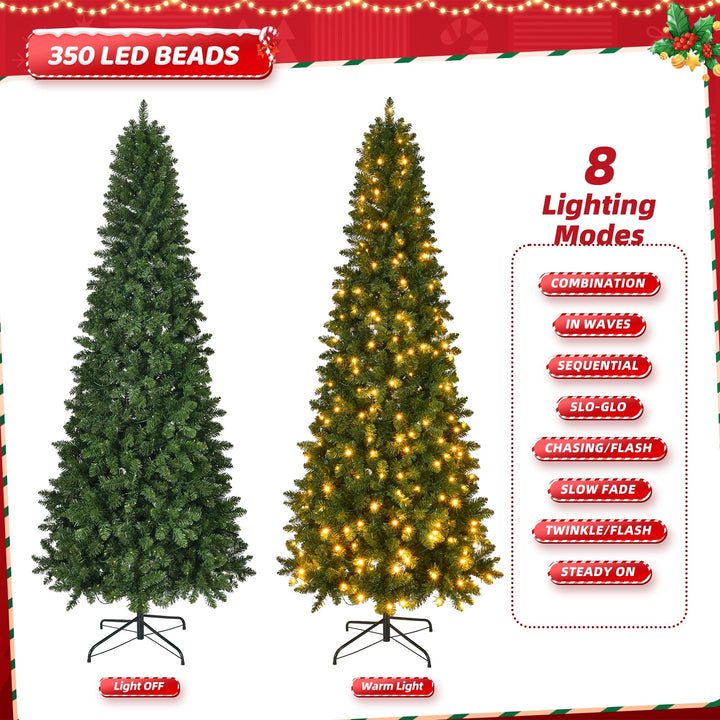 Celebrate your Christmas with this Pre-lit Pencil artificial Christmas tree, which has 1075 realistic branch tips with 350 LED Warm White Lights. These durable branches are made of odorless and non-flammable PVC material, which is not only environmentally friendly but also looks very realistic.Simple Christmas tree allows you to decorate it freely with Christmas stockings, colored balls, lights or other ornaments according to your own preferences. It is effortless to make the tree fluff due to its hinged construction, while also facilitating its assemble and storage. In short, whether for your home, courtyard, or for commercial places like shops, hotels, the snow flocked tree is the perfect eye-catching decoration to add multiple fun and Christmas flavor to your life!