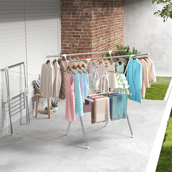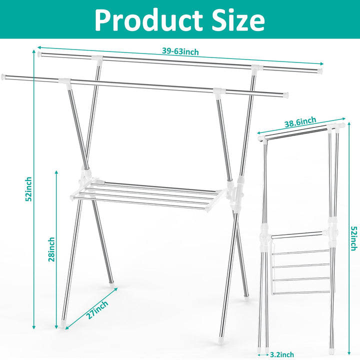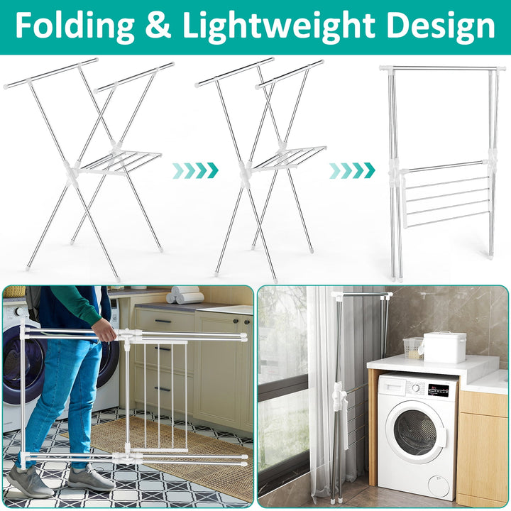This versatile 63-inch clothes drying rack is a must-have for any household. Made from durable stainless steel, it¡¯s built to last and folds flat for easy storage or transport. The X-frame design, paired with a mesh middle layer, gives you plenty of room to air-dry everything from long garments and towels to bedding. Say goodbye to energy-consuming dryers and enjoy a natural, crease-free drying experience with this convenient and space-saving laundry solution.