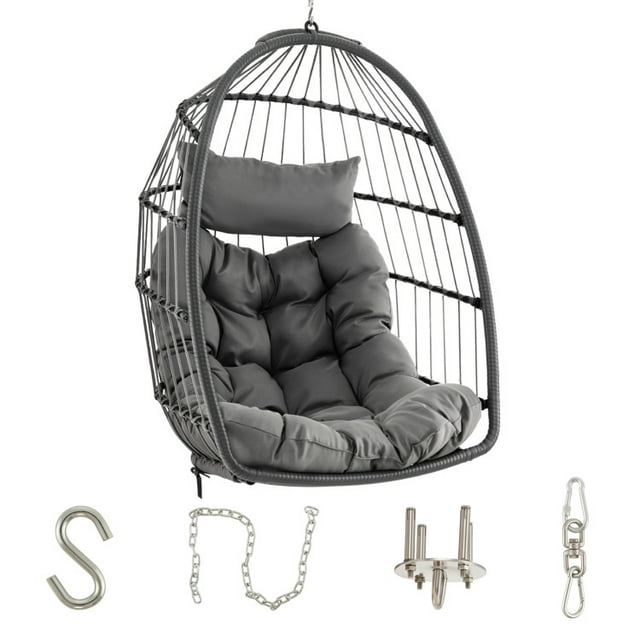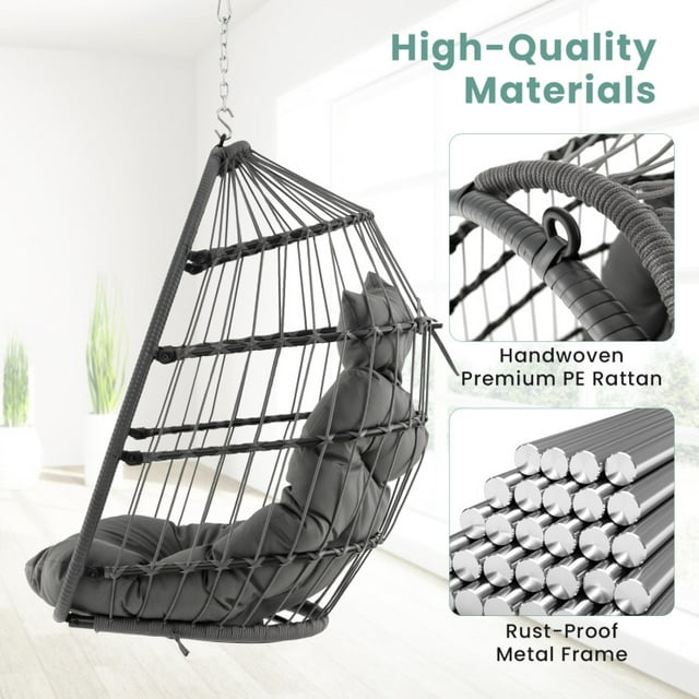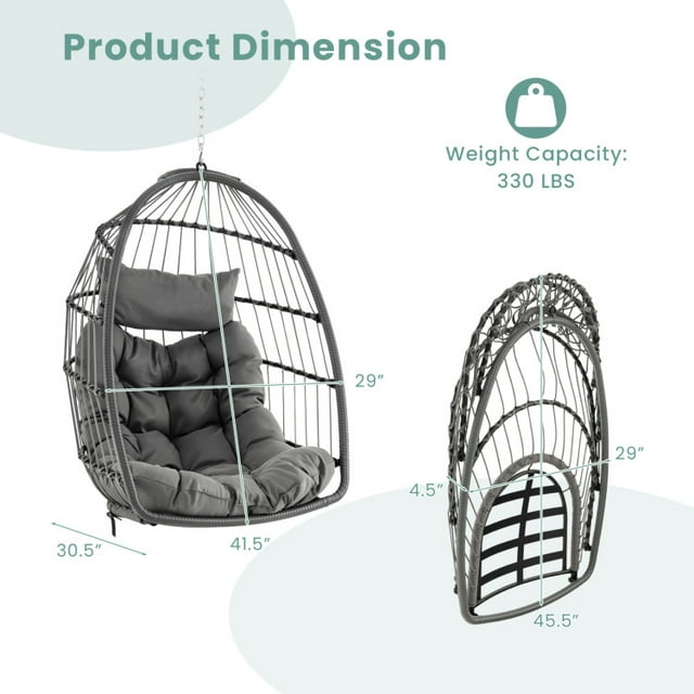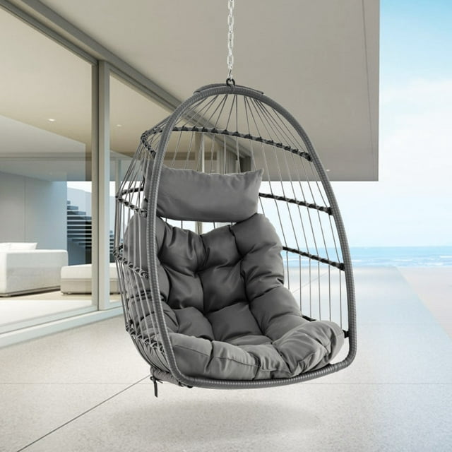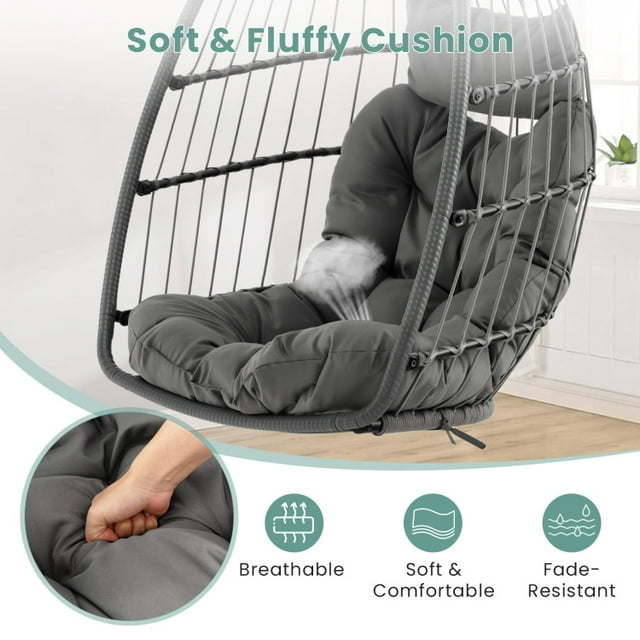 Key Features Enjoy Endless Comfort: Equipped with a large seat cushion and a headrest pillow, this hanging egg chair features high-level comfort. The high-density fillings make the cushions soft and elastic....