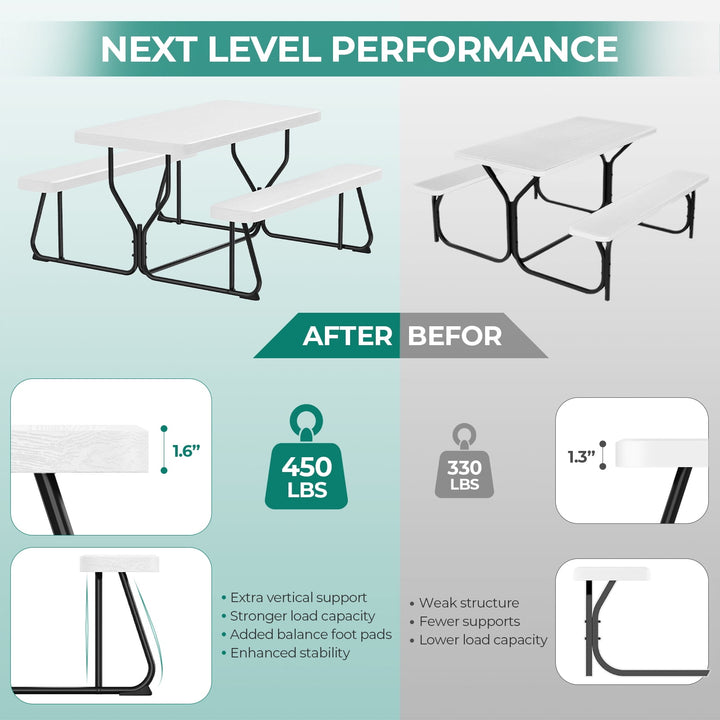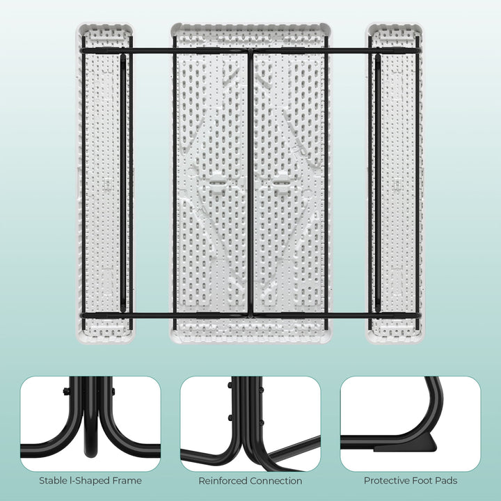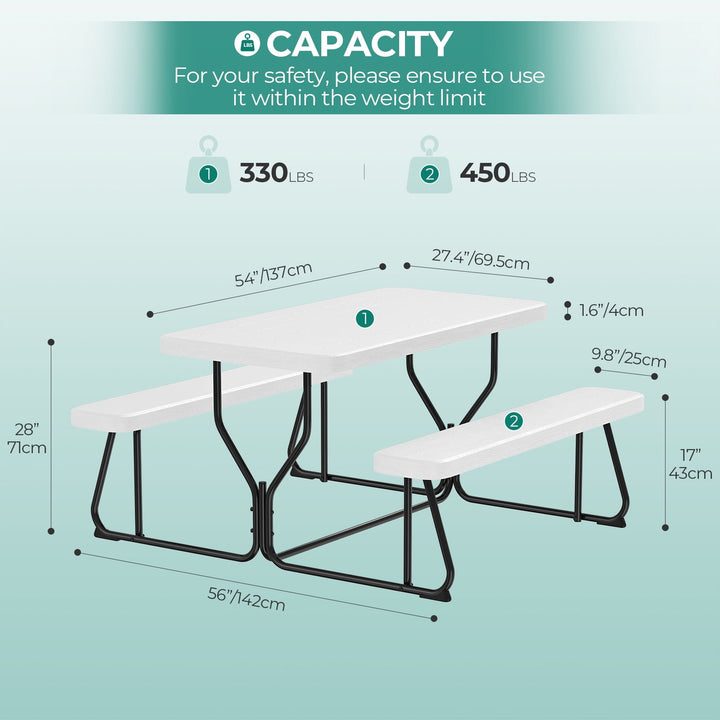 All-Weather Resistant and Perfect For Outdoors: As the outdoor picnic table set, it also has good wear resistance, tough and cold-resistant, ideal for any weather and any place. With UV-protection table surface, ensures durability and will not crack, chip or peel. The table and bench surface are also stain-resistant and easy to clean, you don't have to spend much time on cleaning.