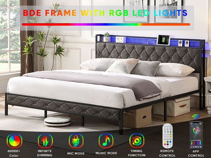 Furnibear King Bed Frame with RGB LED Lights, Charging Station And Storage Headboard | Reinforced Platform | Easy Assembly, Dark Gray