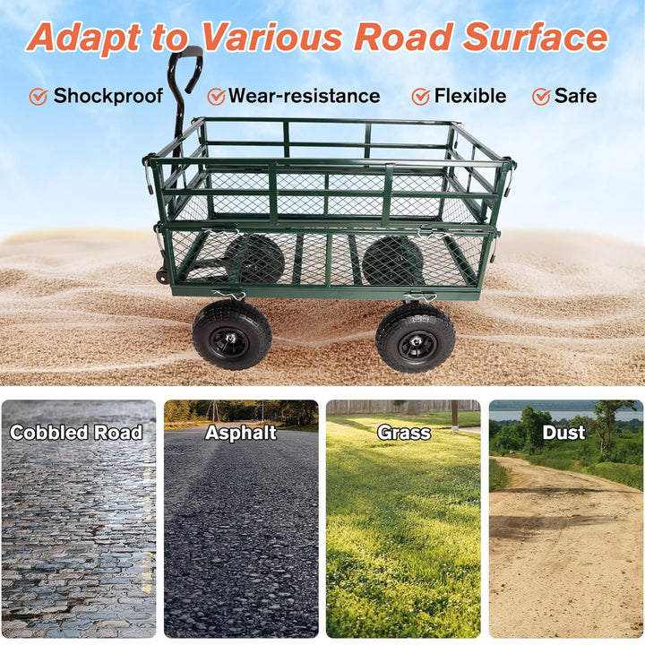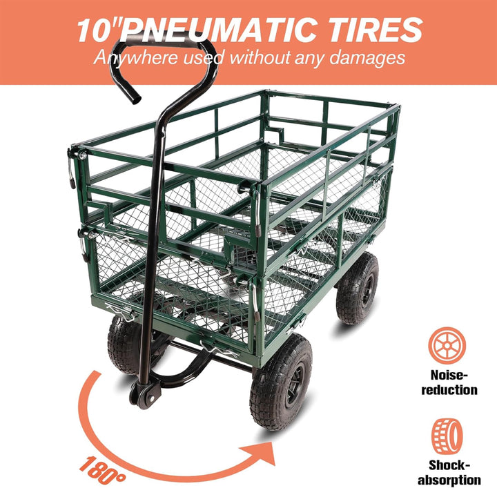 Furnibear Heavy Duty Steel Garden Cart 1500lbs Capacity, 6.35 cu ft, 40.55in x 27.56in Folding Utility Wagon with Double-Layer Removable Side, Green