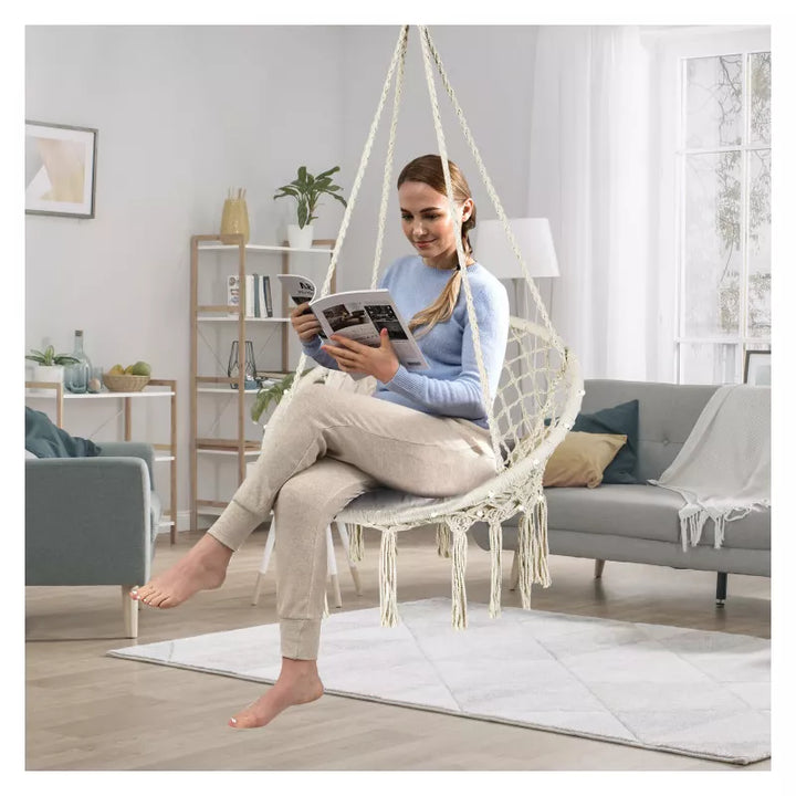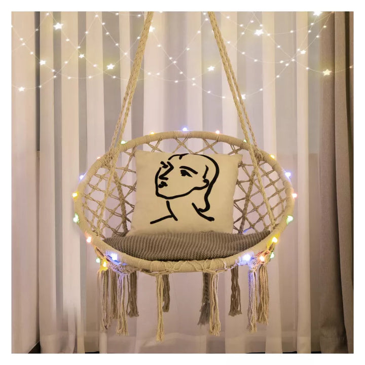 Immerse yourself in tranquility and comfort with our enchanting hammock chair, the perfect addition to your relaxation repertoire. Ideal for both indoor and outdoor settings, this versatile swing offers dual hanging options (single hook or double hook method) to accommodate your space and preferences seamlessly.