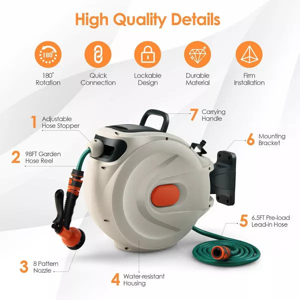 Upgrade your outdoor watering with the SKONYON Hose and Reel Set. Its automatic rewind system ensures tangle-free storage, while the 180 swivel wall bracket provides full garden coverage. Built with a rugged PVC hose and reinforced reel (up to 350 PSI, UV and weather-resistant), it features an 8-pattern adjustable nozzle for versatile spray options. Comes with a 98ft hose, 6.5ft lead-in, and all mounting hardware for easy installation.