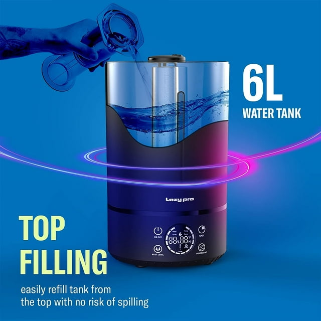 Discover ultimate comfort with the HUMIDIMASTER 2023 6L Cool Mist Humidifier. Designed for large bedrooms and spacious rooms, this top-fill ultrasonic humidifier boasts a generous 1.6-gallon capacity, providing continuous soothing mist for up to 60 hours. Engineered for quiet operation, it ensures p