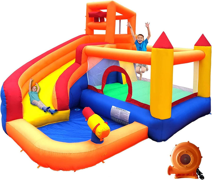 - 【Make the Childhood Unforgettable】This 5 in 1 multifunctional bouncy house greatly improved kids interests in outside sports. Its features a dart game, a basketball hoop, an ideal size bounce area with slide, 2 magic green chimney-shaped inflatable , allow your children to put balls hanging on it, and the ball pit pool with 40 balls. Additionally, the pool is safe to use water. This product will definitely make a lot of fun at his/her mother’s knee.