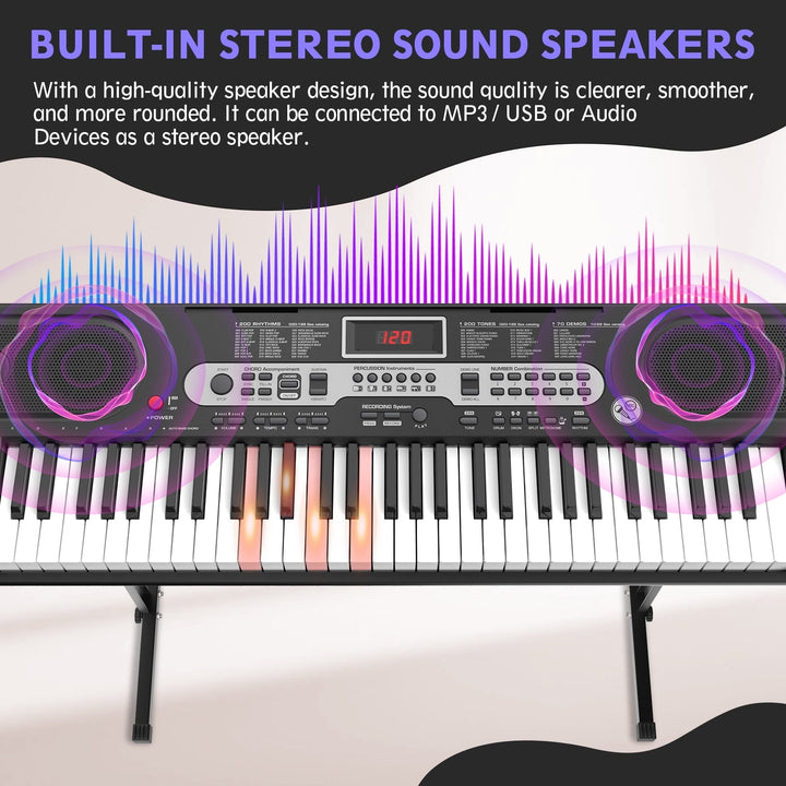 Discover the joy of music with this versatile piano keyboard designed for beginners and aspiring players. Featuring 61 responsive keys, this electric piano keyboard includes lighted keys in teaching mode, 200 tones, 200 rhythms, and 70 demos to build your skills. Dual speakers deliver rich stereo sound, while multiple connections support microphones, headphones, and audio devices for versatile keyboard music practice. Use the adapter indoors or add batteries for portable outdoor play. This electronic keyboard piano kit also comes with stand, bench, and accessories for a complete setup.