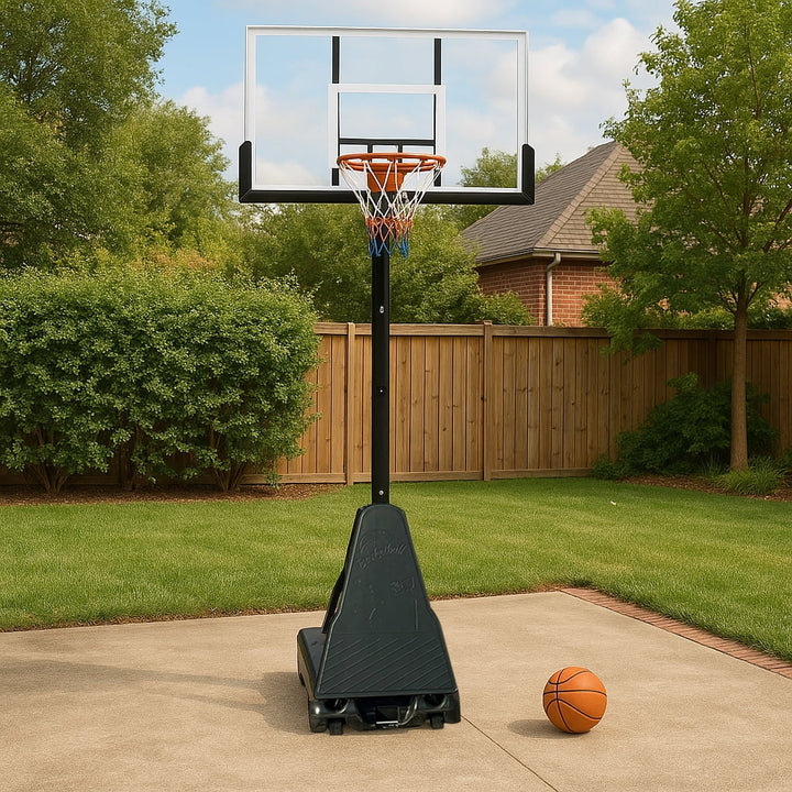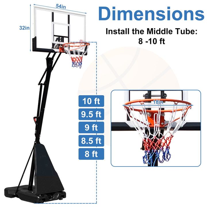 Transform your driveway, backyard, or indoor space into a dynamic basketball court with the 54" Adjustable Portable Basketball Hoop System. Built for versatility and durability, this goal features a 7.5¨C10 FT height-adjustable mechanism, making it ideal for players of all ages and skill levels. The heavy-duty steel frame and weather-resistant backboard ensure long-lasting performance, while the built-in wheels allow effortless relocation for games at home, parks, or events.