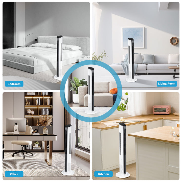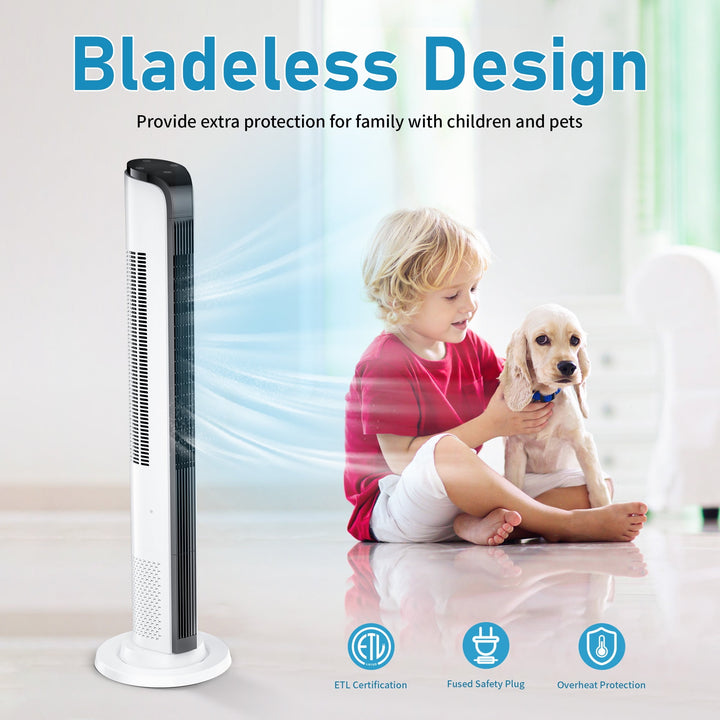 Product details This 43" tower fan uses space-saving tower design without blades to create a full and satisfying breeze. It will protect your family from unnecessary harm. With 3 wind speed...
