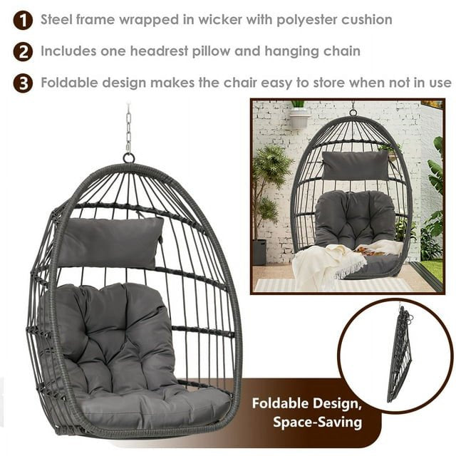 [Humanized Design] - The seat cushion is generously thick, offering exceptional comfort without feeling the structure of the swing chair. An additional headrest pillow enhances lounging comfort to create an unparalleled experience. The curved design of the back of the egg chair aligns with the ergonomic needs of the human body. The folding design makes storage a breeze.