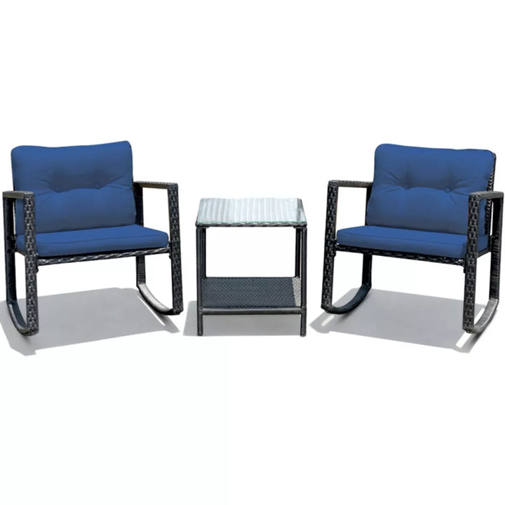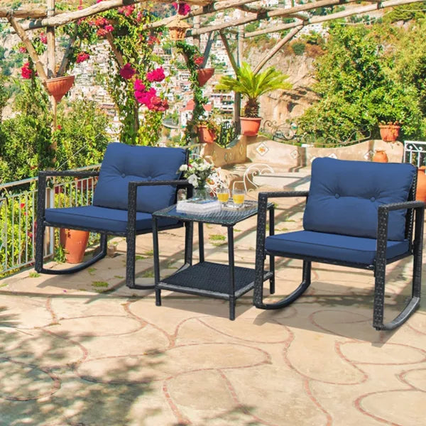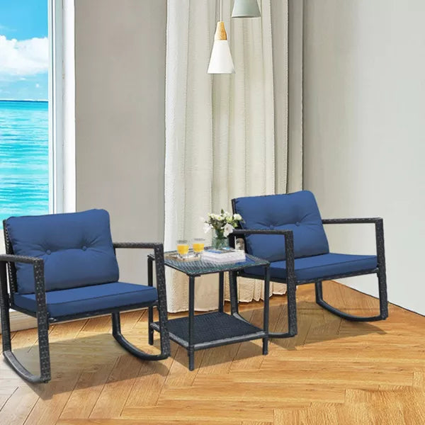 Elevate your outdoor leisure time with Bistro Set, featuring two elegantly designed rocking chairs and a matching coffee table. Crafted for comfort and style, this set seamlessly integrates into any home decor. Enjoy the soothing motion of the rocking chairs, enhanced by soft, thick cushions that ease pressure and fatigue. Whether you're looking to unwind indoors or cherish moments outdoors, this set is the perfect companion for quality relaxation. Ideal for gatherings with friends or cozy moments with a loved one, it promises to enrich your living space with comfort and elegance.
