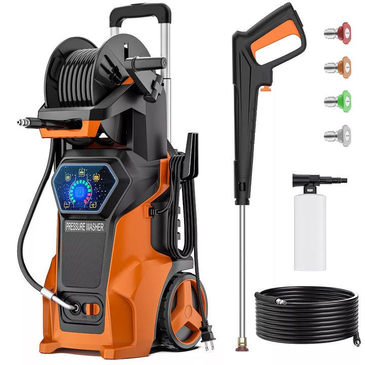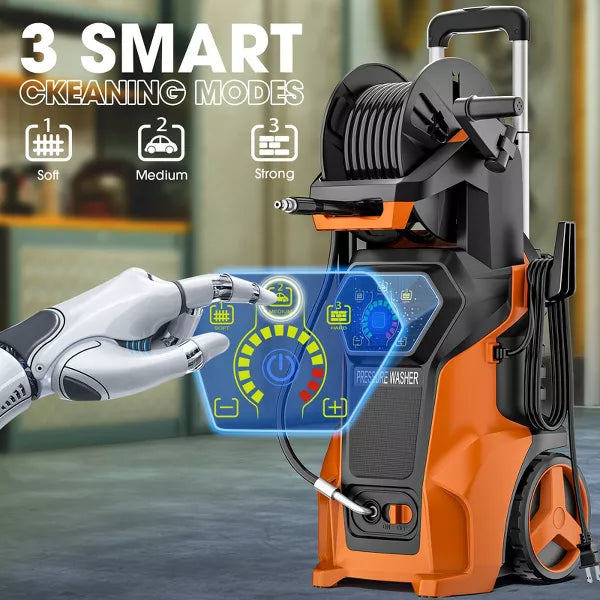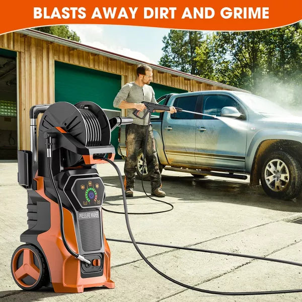The SKONYON 3800 PSI Electric Pressure Washer delivers powerful cleaning with a 1800W motor, reaching 3800 PSI and 2.6 GPM. Ideal for driveways, patios, cars, and more, the foam cannon applies rich detergent for effective cleaning. Three adjustable pressure settings and four nozzles offer versatility for any surface. The LED control panel ensures easy operation, while the Total Stop System (TSS) conserves energy by shutting off the pump when idle. Designed with a telescoping handle, large wheels, and a 19.7-ft hose, it easy to maneuver and store. Safe, reliable, and efficient our go-to solution for outdoor cleaning.