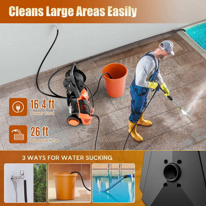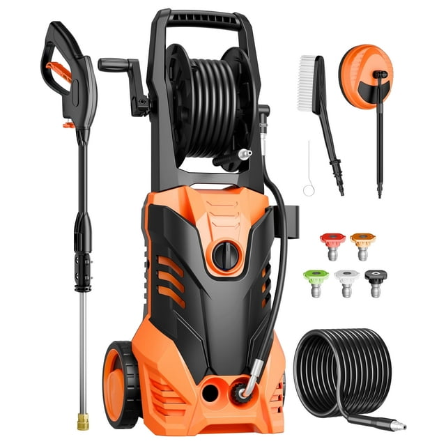 Tackle your toughest cleaning tasks with ease using this 3000 PSI Electric Pressure Washer. Powered by a high-performance 2200W motor and delivering a strong 2.0 GPM water flow, this washer blasts away mud, grime, and stubborn dirt from vehicles, homes, patios, and driveways. Five interchangeable nozzles allow you to adjust your spray for everything from heavy-duty scrubbing to delicate rinsing. Designed with your safety in mind, the auto-stop system, thermal protection, and overload safeguards ensure reliable operation. Thanks to the built-in wheels, ergonomic handle, and hose reel, this power washer is easy to move and store, making it a must-have for maintaining a spotless home and outdoor space.