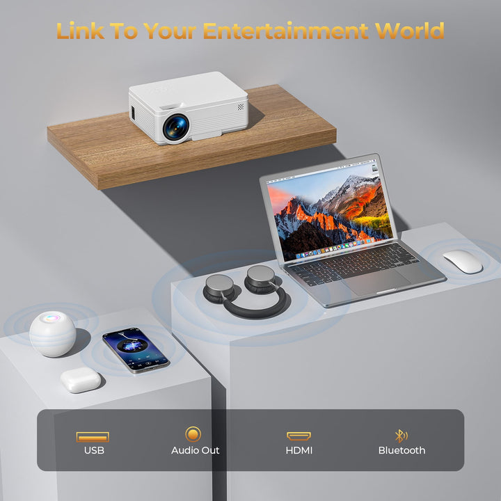 Mini projector be the best choice for patio party, family gatherings, meetings, games and videos, enjoy the leisure and entertainment time by the projector. Supports 1080P video, can show on 200-inch...