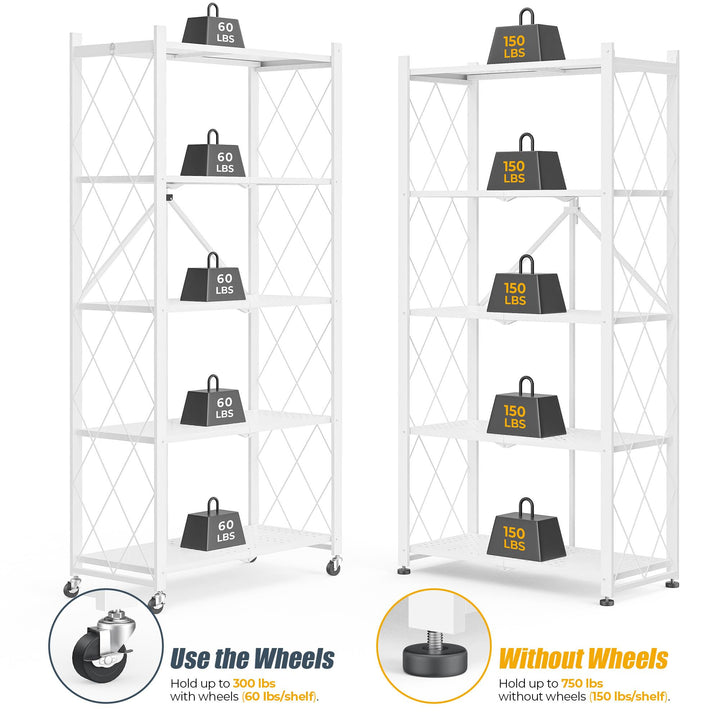 Furnibear 5-Tier Folding Storage Shelves with Wheels, Foldable Metal Rack, Collapsible Shelves for Garage, Kitchen, Basement, White