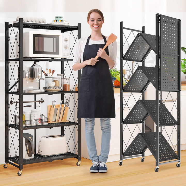 Tidy up any space with these folding storage shelves. Built from durable metal with a rust-resistant powder-coated finish, each shelf supports up to 150 lbs, totaling 750 lbs. This foldable shelf folds flat to 3.54" wide for easy storage under beds or behind doors. Ideal for garages, kitchens, and basements, it comes pre-assembled and features high-quality swivel wheels for effortless mobility. Whether you¡¯re organizing tools, pantry items, or potted plants, this collapsible shelf is the smart storage solution.