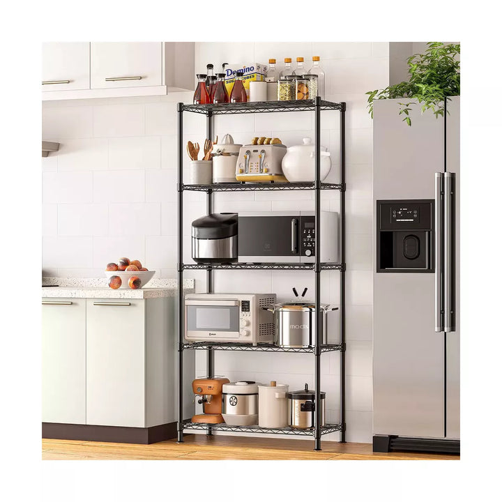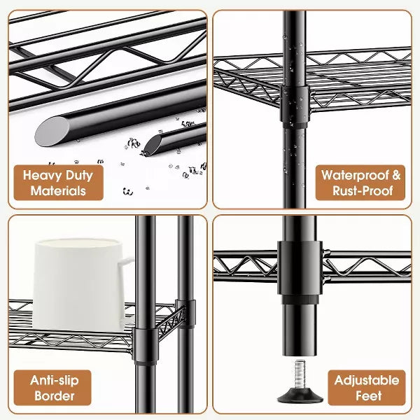 The SKONYON Adjustable Metal Shelving Units are the ultimate storage solution for any space. Whether you choose the 4-tier or 5-tier model, both units are made from durable, rust-resistant steel and feature adjustable shelves that can hold up to 250 lbs (4-tier) or 110 lbs (5-tier) per shelf. These versatile units are ideal for organizing everything from heavy tools to everyday kitchen items. Their sleek black design makes them a perfect fit for home, office, or garage use, while their adjustable leveling feet and anti-slip borders ensure stability and security on uneven floors.