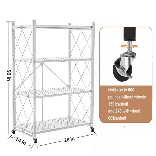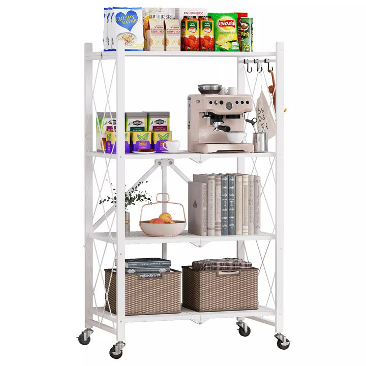 4 Tier Foldable Storage Shelf Metal Shelves with Wheels and Hooks