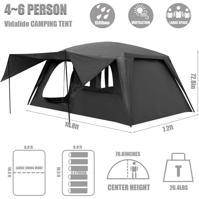 GOOD VENTILATION SCENIC VIEWS OF THE OUDOORS: This 4 6 person tent has 3 mesh doors, 2 mesh windows mesh tent top, which allow the breeze to come in and keep the bugs out. Top large mesh roof makes it available to watch stars with a wide view at night.