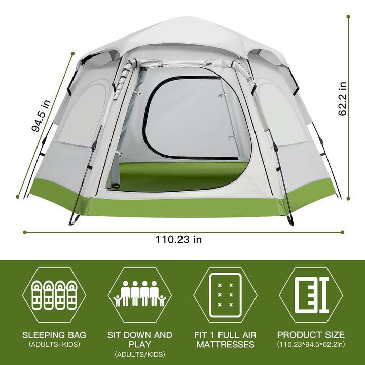 Experience ultimate outdoor comfort with this durable camping tent, featuring a unique hexagonal structure for enhanced stability and superior wind resistance. Spacious enough for four people, it measures 110.24¡± ¡Á94.49¡± ¡Á62.2¡± and offers cozy accommodation for families or small groups. The innovative pop-up design allows for effortless setup and takedown in just 60 seconds, making it a perfect choice for quick adventures. Built for all seasons, this family tent is ideal for camping, hiking, and backpacking in any weather. Lightweight metal door poles create a convenient front vestibule without adding extra weight, enhancing your tent camping experience.
