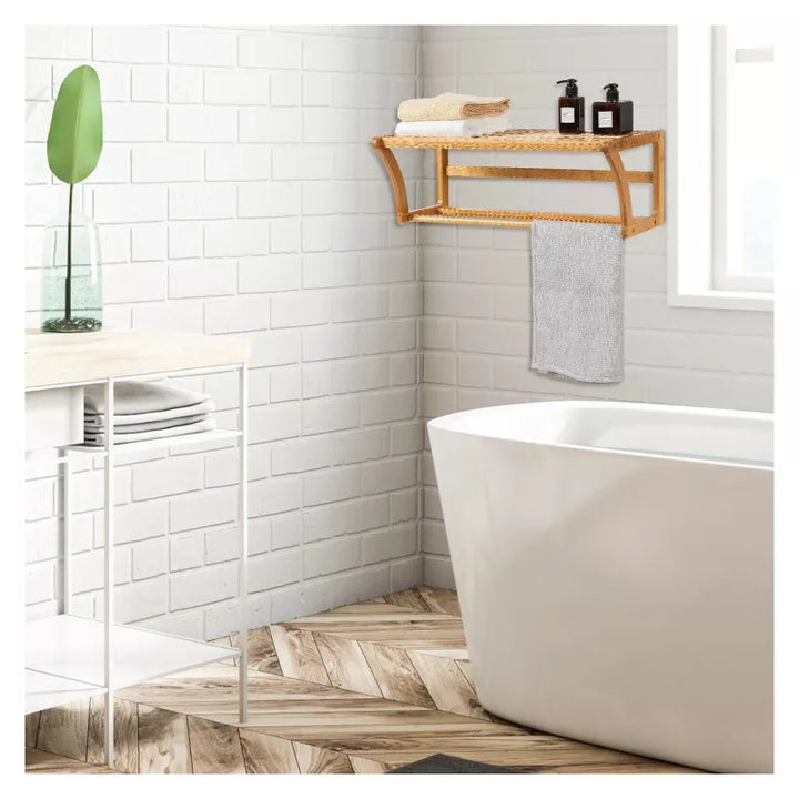 Transform your bathroom or entryway with our bamboo towel rack, designed for stylish organization. Crafted from natural bamboo, this rack boasts exceptional durability and toughness, supporting up to 22lbs with ease. Ideal for bathroom or sauna use, its sturdy construction ensures reliability for long-term use. Featuring a shelf and towel bar, it maximizes storage space while utilizing wall space efficiently, offering a space-saving solution for any room. Its versatile design lends itself to various occasions, keeping your space organized and clutter-free. Plus, its elegant and classic design effortlessly blends with any decor, serving as the perfect decorative accent for your home. Upgrade your space with this premium bamboo towel rack today!