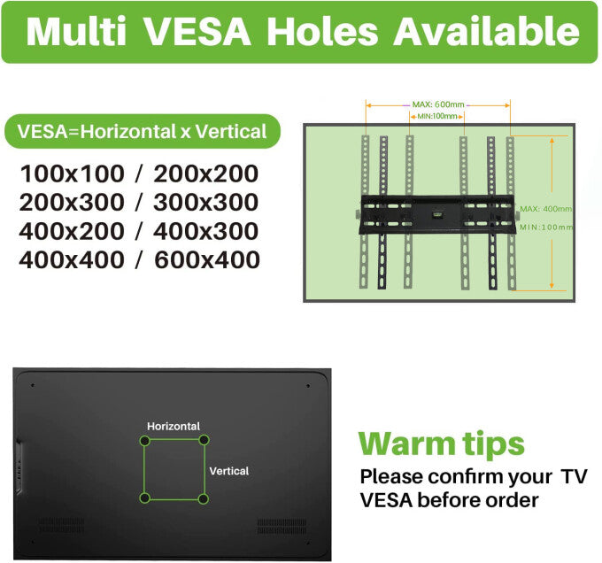 - Fits most 26-60 Inch TVs:Please verify TV VESA (the mounting hole patterns of tv back) within 75*75mm to 400*400mm and TV less than weight 99lbs. Up to 16 inch wood stud spacing.