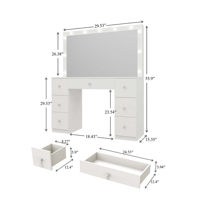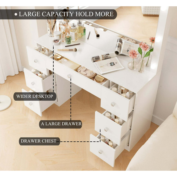?: Ample Storage with 7 Drawers: With seven spacious drawers, this vanity offers plenty of storage for your beauty essentials, jewelry, makeup, brushes, and other personal items, keeping everything neatly organized and within easy reach.