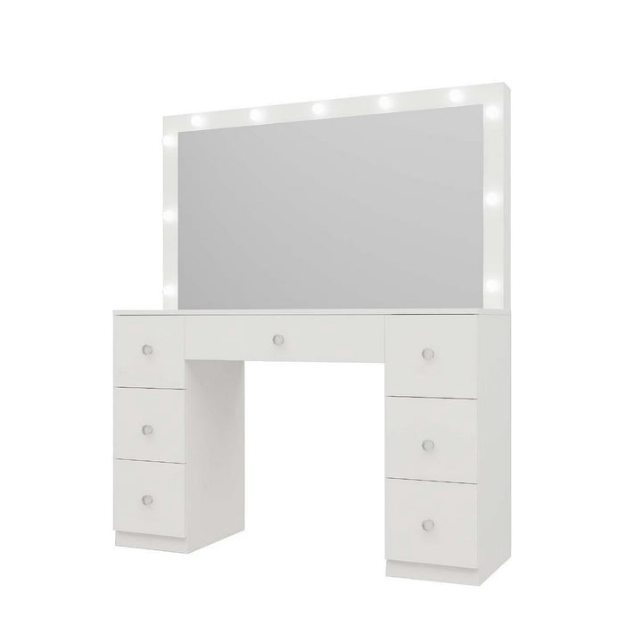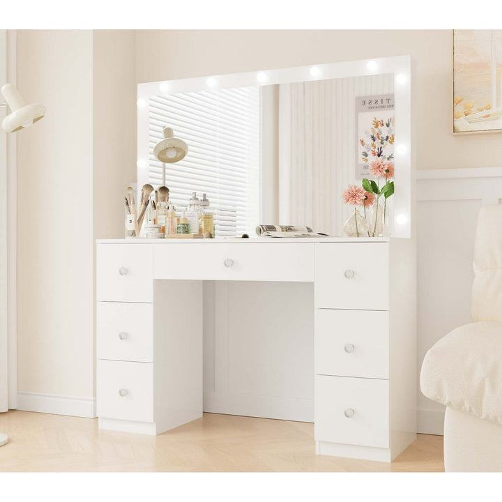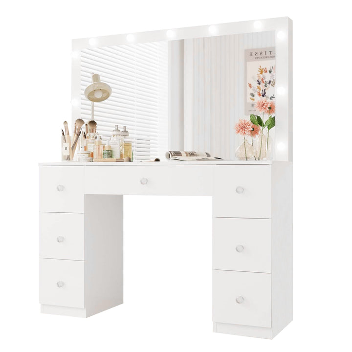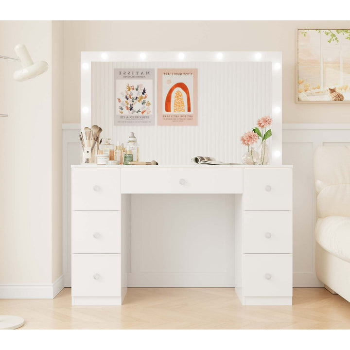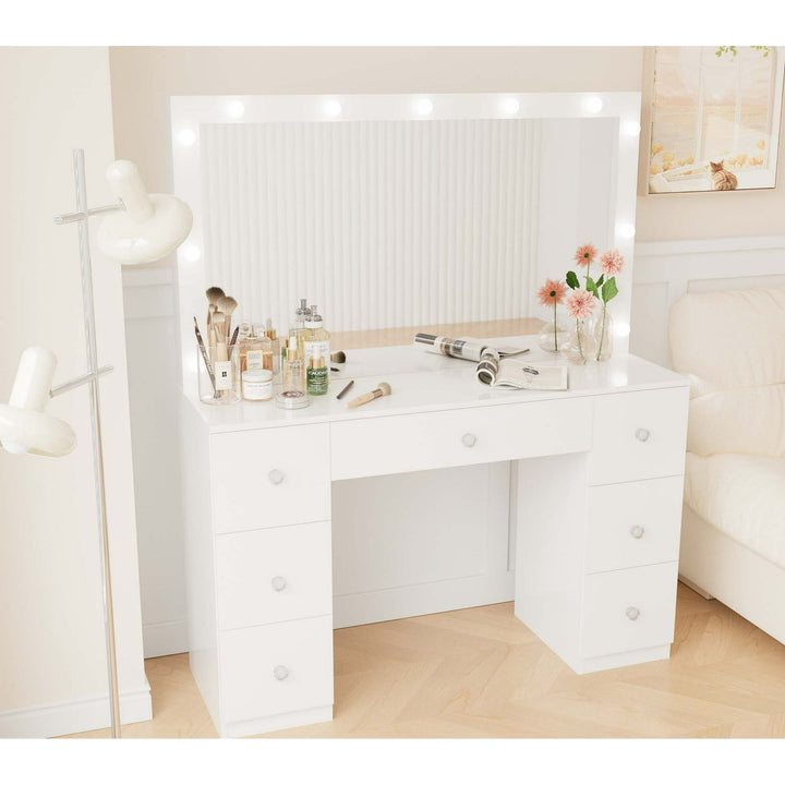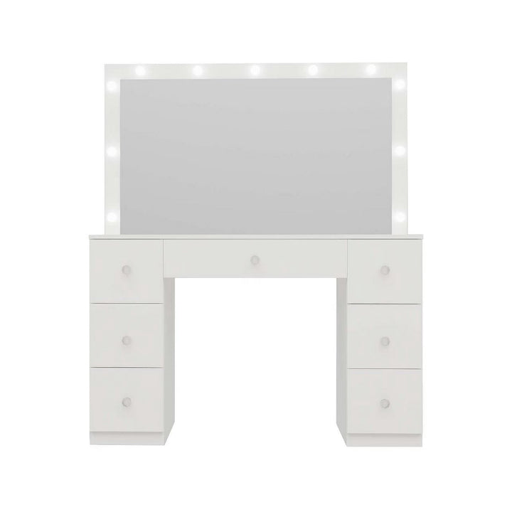 This Vanity Desk with Mirror and LED Lights offers a perfect blend of style and functionality, making it an ideal addition to any bedroom or dressing room. Designed with a sleek white finish, it provides a modern and elegant aesthetic that complements various interior decors. The built-in LED lights surrounding the mirror offer bright, adjustable lighting, ensuring that you can apply makeup or style your hair with precision. Featuring 7 spacious drawers, this vanity provides ample storage space for cosmetics, jewelry, brushes, and other beauty essentials, helping you keep everything organized and easily accessible. Whether you're getting ready for a busy day or preparing for a night out, this vanity table is designed to enhance your routine with both convenience and sophistication. Its durable construction ensures long-lasting use, while the clean, minimalist design maintains a fresh and uncluttered look in your space. Perfect for those who appreciate both form and function, this vanity table is a must-have for anyone seeking a stylish and practical dressing area.