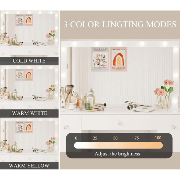?: Built-in LED Lighting: The vanity comes equipped with adjustable LED lights around the mirror, providing bright, even illumination perfect for makeup application, skincare routines, or hairstyling, ensuring you look your best in every detail.